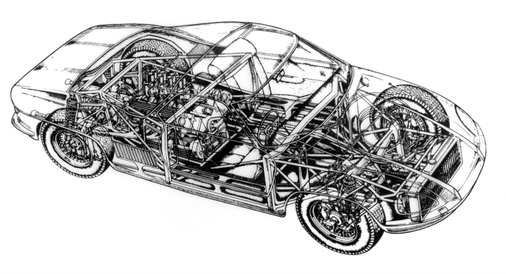 Όμως αυτό που παρέμεινε ήταν οι πόρτες… ψαλίδι, που ανοίγουν κάθετα προς τα πάνω. Και βέβαια ας μην γελιόμαστε, παρά την θεατρική αυτή κίνηση πολύ δύσκολα έμπαινε κανείς στο αυτοκίνητο και πολύ πιο δύσκολο έβγαινε, ειδικά αν φορούσε φούστα. Κάτι που όμως ήταν αναγκαίο λόγο του πλαισίου το οποίο ήταν χωροδικτύωμα. Η λύση αυτή που αποτελείται από πολλές σωλήνες μικρής διαμέτρου κολλημένες μεταξύ τους, ώστε να διαχέουν τις δυνάμεις σε τρείς διαστάσεις, αποτελούσε τότε την καλύτερη λύση (τότε δεν ήταν δυνατή ακόμα η χρήση ανθρακονημάτων) για χαμηλά νούμερα παραγωγής, αν και είναι ιδιαίτερα χρονοβόρα και σχεδιαστικά απαιτεί πολύ χώρο, ενώ η κάλυψη με αεροπορικό αλουμίνιο (!) είναι και αυτή και χρονοβόρα και κοστοβόρα. (Μόνο το πάτωμα ήταν κατασκευασμένο από fiberglass.) Ο λόγος του χώρου όμως ήταν τελικά και η βασική αιτία που επιλέχτηκε η χρήση της πόρτας που ανοίγει κάθετα προς τα πάνω, επειδή απαιτούνταν μεγάλο χείλος μέχρι το κάθισμα. Και αυτό γιατί περιμετρικά περνούσε το πλαίσιο για μεγαλύτερη ακαμψία. ( Ό ίδιος ήταν και ο λόγος για τον οποίο η Mercedes-Benz κατέληξε στις πόρτες «φτερά γλάρου» -gull wings- για την 300SL.)