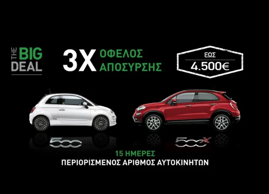 Μια νέα προωθητική ενέργεια τρέχει από την FCA Greece και έχει την ονομασία «The Big Deal». Η μεγάλη ευκαιρία για την απόκτηση ενός Fiat 500 και του μεγαλύτερου 500Χ με τον SUV χαρακτήρα είναι τώρα σύμφωνα με την ελληνική αντιπροσωπεία της φίρμας.
