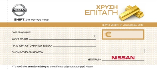 Από την Πέμπτη 14 Οκτωβρίου 2010 και μέχρι το τέλος του έτους, η Νικ. Ι. Θεοχαράκης ΑΕ προσφέρει στους υποψήφιους πελάτες τη «Χρυσή Επιταγή» η οποία δίνει όφελος για κάθε αγορά αυτοκινήτου έως και € 5.700. Συγκεκριμένα κάθε πελάτης που θα επισκεφτεί μια οποιαδήποτε έκθεση Nissan στην Ελλάδα έως 30 Νοεμβρίου 2010, δικαιούται να παραλάβει μια «Χρυσή Επιταγή» η οποία μεταφράζεται σε σημαντική έκπτωση για αγορά καινούριου αυτοκινήτου -το ποσό εξαρτάται από το μοντέλο σύμφωνα με τον παρακάτω πίνακα- με την προϋπόθεση το τελευταίο να έχει τιμολογηθεί έως και την 31η Δεκεμβρίου 2010. Η νέα αυτή προσφορά έρχεται επικουρικά και προστίθεται στις υπάρχουσες προσφορές της εταιρείας. Οι Χρυσές Επιταγές Nissan που έχουν ισχύ έως 31 Δεκεμβρίου 2010, παρέχουν ενδεικτικά ανά μοντέλο το εξής επιπρόσθετο όφελος: