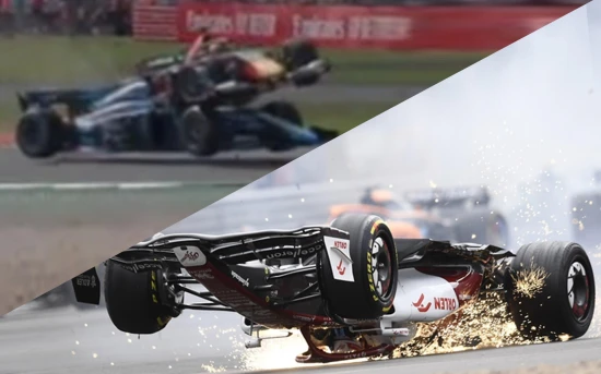 Το δεύτερο ατύχημα έγινε για τον θεσμό της Formula 1 - στην ίδια βρετανική πίστα - με την Alfa Romeo του Zhou Guanyu να αναποδογυρίζει, να σέρνεται στην άσφαλτο ανάποδα, να φεύγει προς την αμμοπαγίδα, να απογειώνεται και να καταλήγει μισοδιαλύμενη ανάμεσα στα προστατευτικά ελαστικά και τα κιγκλιδώματα, λίγα μέτρα από την εξέδρα των θεατών.