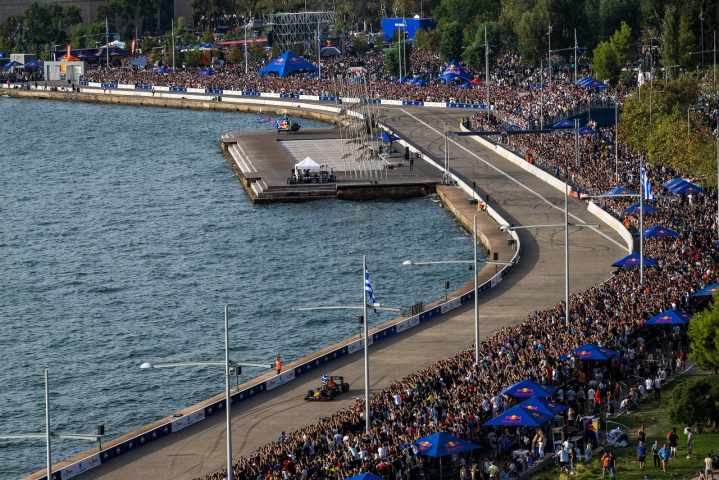 Ο κινητήρας μαρσάρει, η πύλη ανοίγει, ο Patrick Friesacher παίρνει την ελληνική σημαία στα χέρια του και το μονοθέσιο ξεχύνεται στην πίστα. Απόλυτη σιγή στο κοινό… μόνο ο εκκωφαντικός ήχος του κινητήρα V8 των 750 ίππων ηχούσε σε όλη την πόλη. Οι καρδιές όλων χτύπησαν δυνατά, η αδρεναλίνη στο κόκκινο και το θέαμα απλά μαγευτικό! Donuts και εντυπωσιακές επιταχύνσεις γέμισαν τη Νέα Παραλία, που είχε μετατραπεί σε πίστα για την εμβληματική RB8.