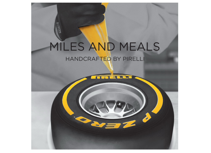 Το “Miles & Meals” παραλληλίζει τις συνταγές μαγειρικής με τις γόμες των ελαστικών. Το βιβλίο παρουσιάζει μερικές από τις καλύτερες γαστρονομικές δημιουργίες της κουζίνας του αρχισέφ της Pirelli, Fabrizio Tanfani, υπό την επίβλεψη του υπεύθυνου φιλοξενίας, Cristian Staurenghi. Πρόκειται για πιάτα που σερβίρονται σε κάθε αγώνα στις τέσσερις γωνιές του πλανήτη. Οι συνταγές – που βασίζονται στην Ιταλική κουζίνα, αλλά συχνά είναι επηρεασμένες από τις γεύσεις των χωρών διεξαγωγής των grand prix – συνοδεύονται από εντυπωσιακές πρωτότυπες φωτογραφίες των συστατικών σε περιβάλλον F1, κυρίως όταν πρόκειται για ζυμαρικά. Έτσι, τα agnolotti έχουν το σχήμα μονοθεσίων που πηγαίνουν 'τραινάκι' στις εισόδους των στροφών, τα paccheri είναι μονοθέσια που κατεβαίνουν μία ευθεία πλαισιωμένα με ελαστικά από τοματίνια και κουκουνάρια, το πασπαλισμένο χοντρό αλάτι παραπέμπει σε μία 'παγίδα' εξόδου από χαλίκια, ένα φύλλο βασιλικού σηματοδοτεί το πράσινο φως ακόμα και ένα χταπόδι παίρνει τη μορφή μηχανικού με οκτώ χέρια – έτοιμου για το ταχύτερο pit stop.