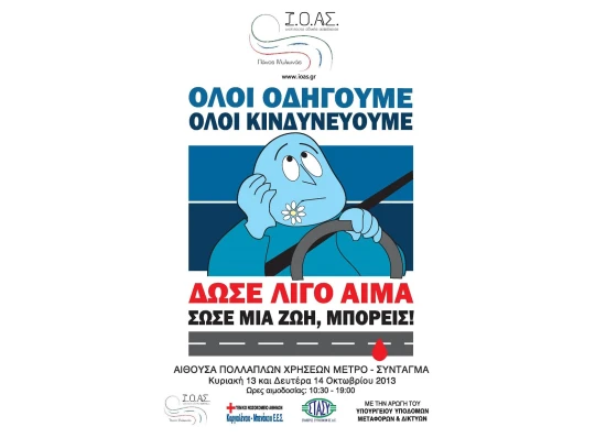 Την Κυριακή 13 και τη Δευτέρα 14 Οκτωβρίου θα πραγματοποιηθεί εθελοντική αιμοδοσία στην αίθουσα Πολλαπλών Χρήσεων του Μετρό στο Σύνταγμα. Είναι μια πρωτοβουλία του Ινστιτούτου Οδικής Ασφάλειας «Πάνος Μυλωνάς» με τη συμμετοχή του Γενικού Νοσοκομείου Αθηνών «Κοργιαλένειο- Μπενάκειο Ε.Ε.Σ.» και της εταιρείας Σταθερές Συγκοινωνίες Α.Ε. αλλά και την αρωγή του Υπουργείου Υποδομών Μεταφορών και Δικτύων με στόχο τη δημιουργία Τραπέζης Αίματος για τα θύματα των τροχαίων. Στην αιμοδοσία του διημέρου 13-14 Οκτωβρίου, από τις 10:30 έως τις 19:00, μπορεί να συνεισφέρει κάθε υγιής άνδρας ή γυναίκα με ηλικία από 18 έως 60 ετών. Η αιμοδοσία εντάσσεται στο πλαίσιο των δραστηριοτήτων του Ι.Ο.ΑΣ. «Πάνος Μυλωνάς» για την ενημέρωση και την ευαισθητοποίηση των πολιτών στα θέματα που άπτονται της προστασίας της ζωής και της σωματικής ακεραιότητας στο δρόμο και το γενικότερο σεβασμό προς το συνάνθρωπο.