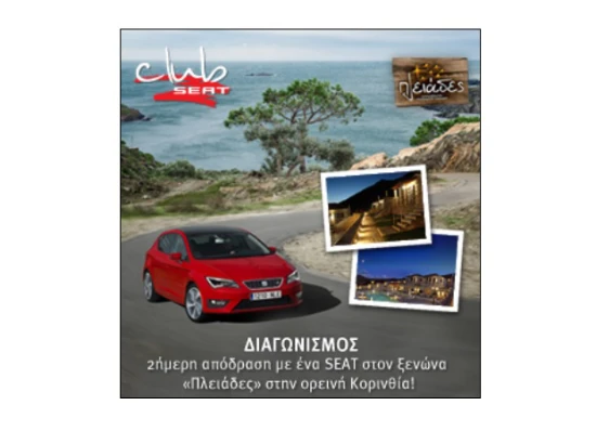 Το Club SEAT δίνει την ευκαιρία σε ένα τυχερό μέλος του να περάσει ένα ευχάριστο και ξεκούραστο 2ήμερο στο σύγχρονο συγκρότημα επιπλωμένων κατοικιών “Πλειάδες” στην ορεινή Κορινθία. Ο τυχερός θα έχει ακόμη την ευκαιρία να απολαύσει τη διαδρομή με ένα μοντέλο SEAT! Ο διαγωνισμός βρίσκεται σε ισχύ μέχρι την Τρίτη 31 Δεκεμβρίου 2013 και περιλαμβάνει δωρεάν διαμονή σε πολυτελές δωμάτιο για δυο άτομα στον ξενώνα στις 25/01/2014 με δυνατότητα για late check-out στις 26/01/2014 κατόπιν συνεννοήσεως.