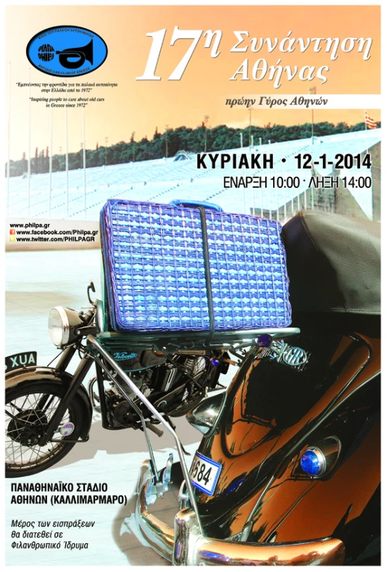 Με το ξεκίνημα της νέας χρονιάς η ΦΙΛΠΑ ανοίγει τη σεζόν με την 1η μεγάλη γιορτινή εκδήλωση. Η 17η Συνάντηση της Αθήνας θα γίνει την Κυριακή 12/1/2014 στο Παναθηναϊκό Στάδιο (Καλλιμάρμαρο), σε συνδιοργάνωση με την Ελληνική Λέσχη Φίλων Κλασικής Μοτοσικλέτας. Ουσιαστικά πρόκειται για τον ‘Γύρο Αθηνών’, ο οποίος μετονομάστηκε σε Συνάντηση μιας και αρκετά χρόνια τώρα παραμένει μια στατική εκδήλωση. Στους συμμετέχοντες θα διανεμηθεί και το νέο ημερολόγιο της ΦΙΛΠΑ για το 2014. Στην εκδήλωση γίνονται δεκτά αυτοκίνητα και μοτοσικλέτες κατασκευής μέχρι το τέλος του 1984 που έχουν σε ισχύ κάρτα FIVA και ασφάλιση. Το δικαίωμα συμμετοχής έχει οριστεί 20 ευρώ για τα αυτοκίνητα και 10 ευρώ για τις μοτοσυκλέτες και σε αυτό συμπεριλαμβάνεται το Ημερολόγιο ΦΙΛΠΑ 2014. Μέρος των εισπράξεων θα διατεθεί σε Φιλανθρωπικό Ίδρυμα.