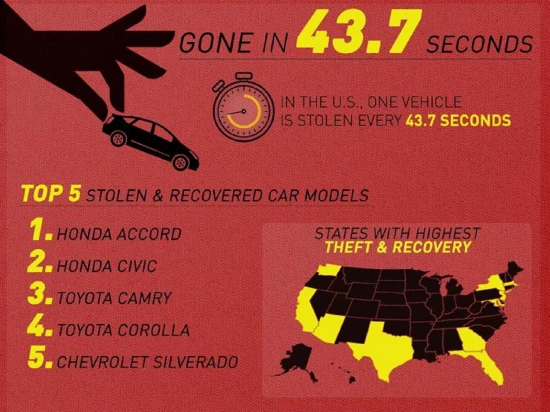 Ιδιαίτερα εντυπωσιακά είναι τα στοιχεία που αποκαλύπτει ένα infographic για τις κλοπές αυτοκινήτων στις Η.Π.Α. μεταξύ των οποίων υπάρχει και το top 5 των αυτοκινήτων που κλέβονται αλλά τα βρίσκει η αστυνομία