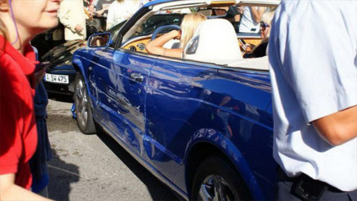 Για άγνωστο λόγο η οδηγός κατάφερε να τσαλακώσει μία Ferrari F430, μία Aston Martin Rapid, μία Porsche 911 και μια ταπεινή Mercedes S-Class. H αξία των αυτοκινήτων που ενεπλάκην στο ατύχημα υπερβαίνει τα 1,1 εκατ. δολάρια, ωστόσο οι υλικές ζημιές είναι πολύ μικρότερο ποσό και ευτυχώς δεν υπήρξε τραυματισμός.Το μόνο που επλήγη είναι το γόητρο της οδηγού και η ασφαλιστική που πλήρωσε.