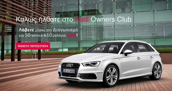 Ο πρώτος διαγωνισμός Audi Owners Club έχει ξεκινήσει από τις 16 Ιουλίου και θα διαρκέσει μέχρι τις 30 Σεπτεμβρίου, δίνοντας την ευκαιρία νε κερδίσουν οι κάτοχοι μοντέλων της εταιρείας χρήσιμα δώρα