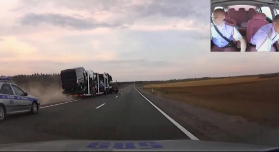 Το σκηνικό δεν είναι από ταινία του Hollywood αλλά λίγο πιο ασυνήθιστη ημέρα δράσης για τη Ρωσική αστυνομία. Κατά τη διάρκεια της περιπολίας τους προσπαθούν να ελέγξουν τον οδηγό μιας νταλίκας φορτωμένη με αυτοκίνητα. Η συνέχεια ξεπερνά την καθημερινότητα ακόμη και για τα δεδομένα της Ρωσίας. Ο οδηγός χτυπά και βγάζει εκτός δρόμου έναν ατυχή που βρέθηκε με το αυτοκίνητό του στην πορεία του φορτηγού. Οι αστυνομικοί προσπάθησαν πυροβολώντας τα ελαστικά να ακινητοποιήσουν το όχημα, ακόμη και πετροβολώντας το. Η συνέχεια επί της οθόνης.