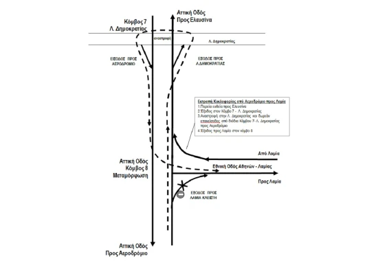 Κλειστή λόγω προγραμματισμένων εργασιών συντήρησης οδοστρώματος θα παραμείνει για οκτώ ώρες η έξοδος της Αττικής Οδού από Αεροδρόμιο προς Λαμία στον κόμβο Μεταμόρφωσης (κόμβος 8), από τις 2:00 τα ξημερώματα μέχρι τις 10:00 το πρωί της Κυριακής 21 Σεπτεμβρίου. Οι οδηγοί θα ακολουθούν παρακαμπτήρια διαδρομή ως εξής: Θα συνεχίζουν στην Αττική Οδό με κατεύθυνση προς Ελευσίνα, στη συνέχεια θα εξέρχονται στην αμέσως επόμενη έξοδο (έξοδος 7 – Λ. Δημοκρατίας), θα αναστρέφουν στον κόμβο Λ. Δημοκρατίας και θα επανεισέρχονται, χωρίς να ξαναπληρώνουν διόδια, από τη Λ. Δημοκρατίας προς Αεροδρόμιο και στη συνέχεια θα εξέρχονται προς Λαμία.