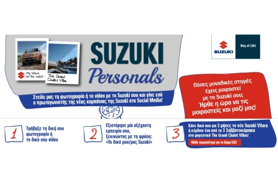 Οι κάτοχοι Suzuki που θέλουν να συμμετάσχουν στο διαγωνισμό, αρκεί να στείλουν μια φωτογραφία ή ένα βίντεό τους, διηγώντας μία από τις αξέχαστες στιγμές που έχουν ζήσεισυντροφιά με το Suzuki τους. Όσοι αποφασίσουν να μοιραστούν την αγάπη για το Suzuki τους, θα έχουν την ευκαιρία να κερδίσουν μοναδικά δώρα: Όσοι ανεβάσουν βίντεο με το Suzuki τους, θα διεκδικήσουν ένα αποκλειστικό test-drive διάρκειας τριών ολόκληρων μηνών, με το πολυαναμενόμενο Νέο Suzuki VITARA, ενώ τρεις τυχεροί από όσους αποφασίσουν να στείλουν φωτογραφία, θα κερδίσουν τρεις διήμερες διανυκτερεύσεις, στο μαγευτικό συγκρότημα φιλανδικών σαλέ, “The Grand Chalet Villas” στα Τρίκαλα Κορινθίας , συντροφιά με ένα Suzuki S-Cross! Για περισσότερες πληροφορίες σχετικά με τη συμμετοχή στο διαγωνισμό, επισκεφθείτε το www.suzuki-personals.gr και βρείτε, αναλυτικές οδηγίες αλλά και πληροφορίες για τα μοναδικά δώρα.