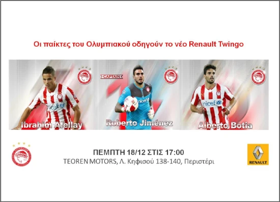 Η Renault, Επίσημος Χορηγός της ΠΑΕ Ολυμπιακός 2014-2015 και τρεις διάσημοι παίκτες του Ολυμπιακού, μας προσκαλούν να ανακαλύψουμε μαζί τους το νέο Renault Twingo, να ανταλλάξουμε ευχές και να κερδίσουμε απίθανα δώρα! Την Πέμπτη 18 Δεκεμβρίου στις 17:00, στις κεντρικές εγκαταστάσεις της TEOREN MOTORS στη Λεωφ. Κηφισού 138-140, οι Ρομπέρτο Χιμένες, Αλμπέρτο Μποτία και Ιμπραήμ Αφελάι θα ‘βολτάρουν’ ανάμεσα στα νέα μοντέλα της Renault και πιο πολύ δίπλα στο νέο γαλλικό δρομέα της πόλης που πλέον κυκλοφορεί με 5 πόρτες και προβάλλει τη χαρούμενη προσωπικότητα, την εξαιρετική ευελιξία, την πρακτικότητα της καμπίνας, τις απεριόριστες δυνατότητες εξατομίκευσης και τις σύγχρονες τεχνολογίες επικοινωνίας. Στην ξεχωριστή αυτή γιορτή οι παρευρισκόμενοι θα έχουν τη δυνατότητα να φωτογραφηθούν με τους αγαπημένους τους παίκτες, να πάρουν αυτόγραφα και να μπουν στη μεγάλη κλήρωση για να κερδίσουν μοναδικά δώρα από τη Renault και τον Ολυμπιακό: