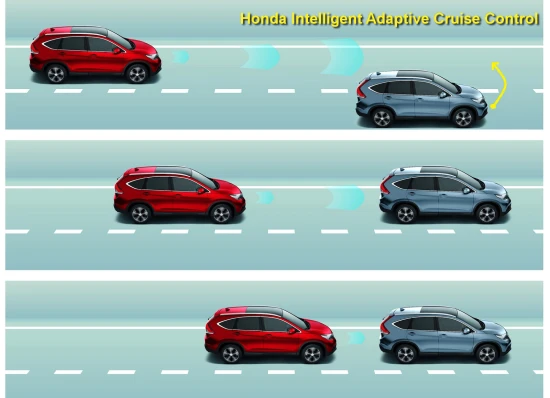 Όπως είπαμε και πιο πάνω, το Intelligent Adaptive Cruise Control θα πρωτοχρησιμοποιηθεί στην έκδοση Executive του ανανεωμένου ευρωπαϊκού CR-V Model Year 2015, βασισμένο στο σημερινό Adaptive Cruise Control (ACC). Τα παραδοσιακά συστήματα ACC διατηρούν μία προεπιλεγμένη ταχύτητα που μειώνεται μόνον για να διατηρηθεί μία ασφαλής απόσταση από ένα προπορευόμενο όχημα. Ωστόσο, εάν ένα άλλο όχημα εισβάλει ξαφνικά από διπλανή λωρίδα, το παραδοσιακό σύστημα ACC αντιδρά πιο αργοπορημένα με αποτέλεσμα να απαιτείται ακόμη πιο απότομο και δυνατό φρενάρισμα. Το νέο σύστημα i-ACC μπορεί να υπολογίζει την πιθανότητα εισόδου ενός οχήματος από άλλη λωρίδα μέχρι πέντε δευτερόλεπτα πριν συμβεί, επομένως είναι σχεδιασμένο για να αντιδρά πολύ άμεσα και ομαλά ώστε να μην ξαφνιάζει τον ανυποψίαστο οδηγό. Σε αυτή την περίπτωση, το σύστημα εφαρμόζει αρχικά ήπια πέδηση, ενώ ένα εικονίδιο εμφανίζεται στην οθόνη του οδηγού, ενημερώνοντάς τον για το λόγο της επιβράδυνσης. Στη συνέχεια παρεμβαίνει με ισχυρότερο φρενάρισμα για προσαρμογή της ταχύτητας ώστε να διατηρηθεί μία ασφαλής απόσταση. Μάλιστα, το i-ACC αναγνωρίζει την πλευρά του δρόμου στην οποία κινείται ο οδηγός, είτε βρίσκετε στη Βρετανία ή στην υπόλοιπη Ευρώπη και ανιχνεύει αυτόματα ποιο από τα διπλανά οχήματα αντιπροσωπεύει το μεγαλύτερο κίνδυνο, οποιαδήποτε δεδομένη στιγμή. Το σύστημα είναι αποτέλεσμα εσωτερικού προγράμματος Έρευνας & Εξέλιξης (R&D) το οποίο ανέλαβε μία διεθνής ομάδα της Honda σε Ευρώπη και Ιαπωνία, και είναι ειδικά σχεδιασμένο για τους ευρωπαϊκούς δρόμους. Έρευνα πάνω στη συμπεριφορά των οδηγών για τη δημιουργία του αλγορίθμου διεξήχθη σε όλη την Ευρώπη.