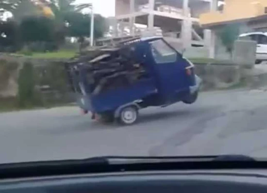 Το φορτωμένο Piaggio Ape 50 προσπάθησε να ανέβει την ανηφόρα φορτωμένο με ξύλα. Οι Ιταλοί που βιντεοσκοπούσαν όλη την προσπάθεια του μικρού 3κυκλου κατέληξαν στο τέλος να βοηθήσουν τον οδηγό που έμεινε σε στάση… σούζας με τα γέλια φυσικά να μην λείπουν, μιας και η εικόνα ήταν αστεία.