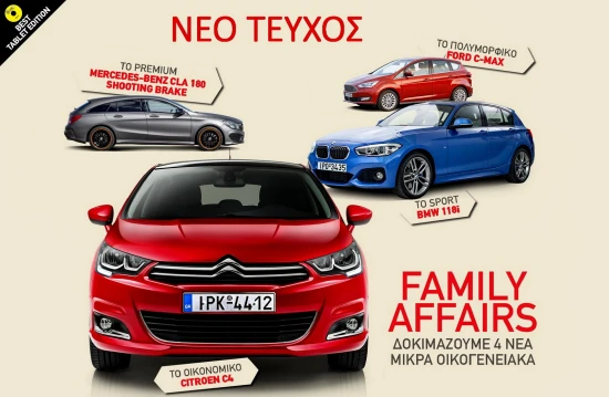 Στο νέο τεύχος του GOCAR Magazine αναλαμβάνουμε δύσκολες υποθέσεις. Οικογενειακές υποθέσεις. Δοκιμάζουμε τέσσερα καινούργια μικρομεσαία: την οικονομική και άνετη Citroen C4 1.6 Diesel, τη σπορ BMW 118i, τη Mercedes-Benz CLA 180 Shooting Brake που συνδυάζει πρακτικότητα με κομψότητα & πολυτέλεια και το ανανεωμένο Ford C-MAX μαζί με την 7-θεσια έκδοση Grand C-MAX.