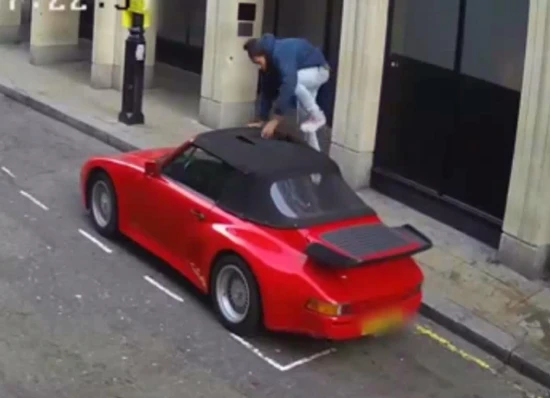 Η κάμερα κατέγραψε όλη την κακόβουλη πράξη ενός «εγκληματία» που κατέστρεψε την υφασμάτινη κουκούλα μιας ξεχωριστής Porsche, ώστε να… μπει για λίγο μέσα στο εσωτερικό του σπορ αυτοκινήτου και μετά από λίγο να ξαναβγει, πατώντας τόσο πάνω στην οροφή του αυτοκινήτου όσο και στην αεροτομή του.
