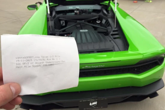 Μία Lamborghini Huracan με τις ανάλογες περιποιήσεις στα μηχανολογικά μέρη έτρεξε την απόσταση του μισού μιλίου και ανέπτυξε ταχύτητα εξόδου 383,9 km/h που είναι νέο παγκόσμιο ρεκόρ. Η συγκεκριμένη Verde Mantis Huracan διαθέτει διπλά turbo αντί της ατμοσφαιρικής αναπνοής και η απόδοση έχει σκαρφαλώσει στους 2.000 ίππους. Εκτός από τις τροποποιήσεις στο κινητήρα των V10 με κυβισμό 5,2 λίτρα, η εταιρεία tuning Underground Racing αντικατέστησε το επτάρι κιβώτιο διπλού συμπλέκτη πους εφοδιάζει τη νορμάλ έκδοση, με ένα σειριακό κιβώτιο αγωνιστικού τύπου που φροντίζει για αμεσότερες αλλαγές αλλά και τη μετάδοση της τεράστιας αυτή δύναμης στους τροχούς. Το προηγούμενο ρεκόρ στη δοκιμασία του μισού μιλίου ήταν 376,2 km/h και είχε επιτευχθεί τον περασμένο Ιανουάριο στη Φλόριντα των ΗΠΑ σε φεστιβάλ WannaGoFast.