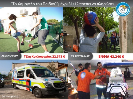 65.777,85 ευρώ: τόσα είναι τα χρήματα που πρέπει να καταβάλει μέχρι τις 31 Δεκεμβρίου 2015 «Το Χαμόγελο του Παιδιού» για Τέλη Κυκλοφορίας και ΕΝΦΙΑ, ενώ παράλληλα θα πρέπει να πληρώσει -όπως κάθε μήνα- πλήθος φόρων με τους οποίους επιβαρύνεται χωρίς καμία ελάφρυνση (Φ.Π.Α., φόρος μισθωτών υπηρεσιών, φόρος ιδιόχρησης ακινήτων, φόρος παραχώρησης ακινήτων, φόρος αποδοχής κληρονομιάς κ.λ.π.). Κάθε 1 ευρώ φορολογίας στερείται από τις δράσεις για τα παιδιά και όλα αυτά την ίδια στιγμή που «Το Χαμόγελο του Παιδιού» κάνει έναν τεράστιο αγώνα για να εξασφαλίσει ΚΑΛΑ ΧΡΙΣΤΟΥΓΕΝΝΑ για τα παιδιά που έχουν ανάγκη: τα 390 παιδιά που μεγαλώνουν στα σπίτια του, εκατοντάδες παιδιά με προβλήματα υγείας, χιλιάδες παιδιά που ζουν στα όρια της φτώχειας!