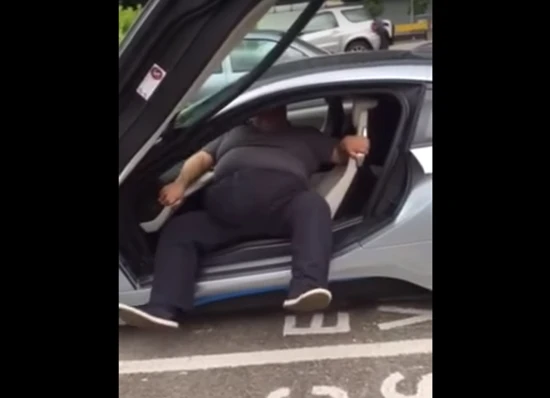 Εύσωμος τύπος προσπαθεί να βγει από BMW i8 (Video)