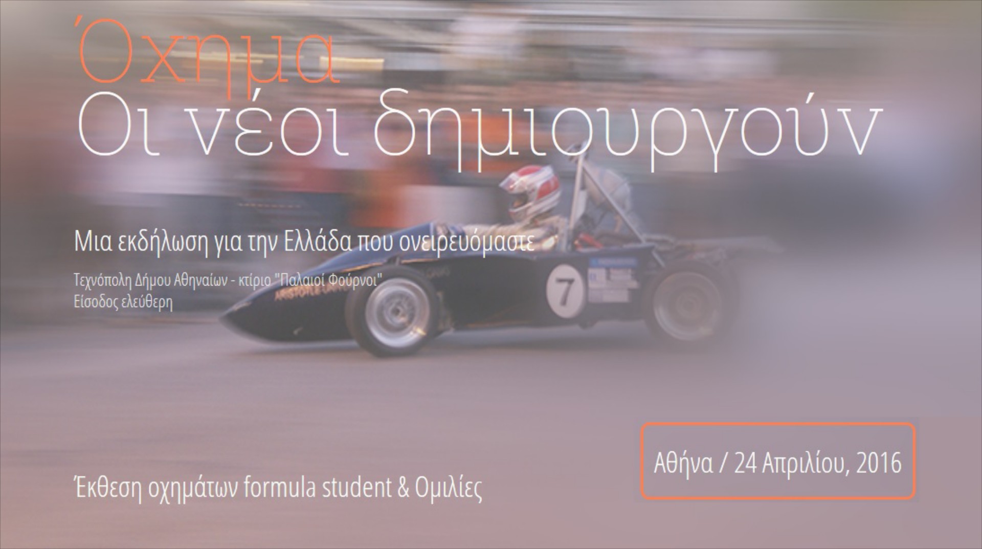 Στις 24 Απριλίου 2016 στην Τεχνόπολη Δήμου Αθηναίων (κτίριο "Παλαιοί Φούρνοι") θα μαζευτούν όλοι οι ανήσυχοι και δημιουργικοί Έλληνες φοιτητές μηχανολόγοι για να συναντήσουν ανθρώπους που πέρασαν από τα ίδια θρανία λίγα χρόνια νωρίτερα και σήμερα εργάζονται στην F1. Στόχος να υπάρξει μια ζύμωση μέσα από συζητήσεις και ομιλίες, αλλά και μια έκθεση οχημάτων formula student. Στην εκδήλωση θα συμμετέχουν οι Πανεπιστημιακές Ομάδες κατασκευής μονοθέσιων οχημάτων τύπου Formula στην Ελλάδα. Η είσοδος είναι ελεύθερη από τις 12:00 το πρωί.