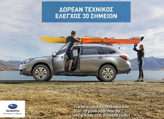 Το καλοκαίρι πλησιάζει και οι μετακινήσεις γίνονται συχνότερες. Έτσι η Subaru για ασφαλέστερες και πιο άνετες μετακινήσεις προσφέρει δωρεάν έλεγχο 30 σημείων στο αυτοκίνητό σας. Η προσφορά ισχύει από τις 9 Μαίου μέχρι τις 3 Ιουνίου σε όλα τα εξουσιοδοτημένα καταστήματα συνεργατών της Subaru που μπορείτε να αναζητήσετε πατώντας εδώ.