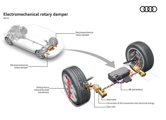 Το σύστημα βαφτίστηκε eROT (electromechanical rotary dampers) και απέχει σε σχέση με τα απλά συμβατικά αμορτισέρ. Αντί για τους απλούς βραχίονες, έχουν τοποθετηθεί «περιστροφικά» αμορτισέρ που απορροφούν την κινητική ενέργεια και τη μεταφέρουν σε έναν ηλεκτροκινητήρα που βρίσκεται πάνω από τον πίσω άξονα. Σύμφωνα με την Audi, το σύστημα έδειξε ότι ανακτά μεταξύ 3 και 613 Watt ενέργειας μετά από αρκετές δοκιμές, κάτι που σημαίνει ότι το μέσο όρο είναι 100 έως 150 Watt. Αυτές οι τιμές είναι πιθανό να δείξουν αισθητή αύξηση της αυτονομίας.