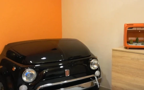 Αν αναρωτιέστε τι μπορεί να ψάχνει ένα εμπρός μέρος αυτοκινήτου στο σαλόνι του κυρίου, τότε είναι σίγουρο ότι δεν θα το βρείτε. Και όμως ο λάτρης (προφανώς) της ιταλικής φίρμας διάλεξε το εμπρός μέρος ενός παλιού 500 να διακοσμεί ένα σημείο του living room του. Βέβαια, δεν μπορεί να μην έχει και κάποια χρηστικότητα (λογική που υιοθετεί κυρίως ο αντρικός πληθυσμός), γι’αυτό και το υπέροχο αυτό «έπιπλο» κρύβει μία τηλεόραση, η οποία αναδύεται με την ενεργοποίησή της. Επίσης, κάτω από το καπό, ο αποθηκευτικός χώρος έχει καταληφθεί με Playstation 4 και άλλα τεχνολογικά καλούδια. Τώρα μήπως τελικά σας γυάλισε;