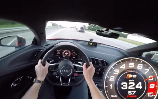 Χωρίς όρια κινείται το βελτιωμένο Audi R8 στους εθνικούς δρόμους της Γερμανίας και με μια κάμερα τοποθετημένη στην καμπίνα μπορείτε να δείτε από τη θέση του οδηγού ενός Audi R8 πως είναι να κινείσαι με 324 km/h.