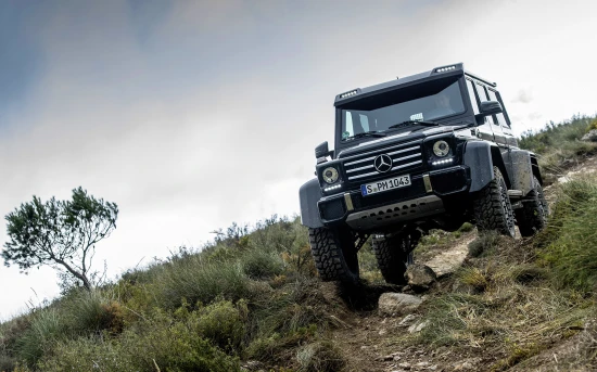 Συγκριτικά με τις φυσιολογικές G-Class, η G 500 4×4² έχει υπερδιπλάσια απόσταση από το έδαφος: από τα 21 στα 45 cm! Για να επιτευχθεί κάτι τέτοιο, οι άξονες και τα διαφορικά βρίσκονται πάνω από το κέντρο των τροχών (portal axles). Εκτός δρόμου η συγκεκριμένη έκδοση είναι ασυναγώνιστη. Αλλά και στην άσφαλτο τα... πηγαίνει καλά, χάρη στα φαρδύτερα κατά 30 cm μετατρόχια, τα ρυθμιζόμενα αμορτισέρ με θέση λειτουργίας Sport και τους τροχούς των 22 ιντσών που πατούν σε ελαστικά 325/55.