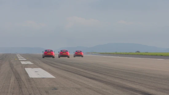 Όχι ένα, ούτε δύο αλλά τρία Stinger GT βρέθηκαν στο αεροδρόμιο του Cornwall, στη νοτιοδυτική Αγγλία. Εκεί, με τη βοήθεια του 3.3 V6 twin-turbo απόδοσης 370 ίππων κατάφεραν να αναπτύξουν ταχύτητες άνω των 240 km/h.