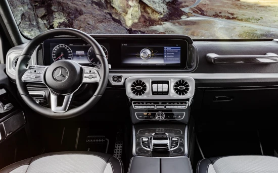 Στη νέα γενιά όμως της G-Class, που θα κάνει σύντομα πρεμιέρα, όλα αυτά τα αλλάξουν. Όπως φαίνεται από τις επίσημες φωτογραφίες που δημοσίευσε η εταιρεία από τη Στουτγάρδη, η εικόνα του εσωτερικού είναι ανάλογη μίας σύγχρονης Mercedes-Benz. Πολυτελείς επενδύσεις, δύο μεγάλες οθόνες 12,3 ιντσών για τον πίνακα οργάνων και το σύστημα πολυμέσων, ηχοσύστημα με 16 ηχεία, ακόμη και touchpad στη βάση της κεντρικής κονσόλας! Και όλα αυτά ενώ διατηρήθηκαν ορισμένα ρετρό στοιχεία, όπως οι λαβές των θυρών ή τα προστατευτικά σημεία στο αμάξωμα.