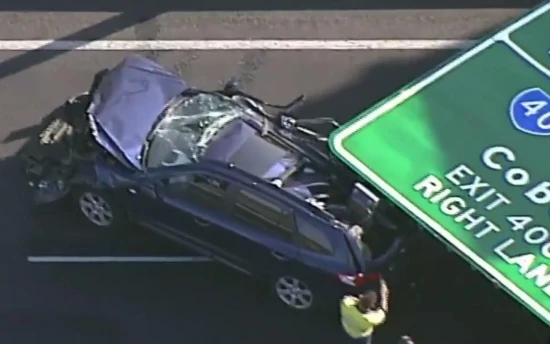 Μία dashcam (κάμερα τοποθετημένη στο παμπρίζ του αυτοκινήτου) κατέγραψε το ατύχημα, το οποίο συνέβη την ώρα που ένα Hyundai Santa Fe κινείτο στην αριστερή λωρίδα. Μία τεράστια πινακίδα οριζόντιας σήμανσης κατέρρευσε, πέφτοντας κάθετα στον δρόμο. Αυτή προσγειώθηκε μόλις λίγα εκατοστά μπροστά από το Santa Fe, καταπλακώνοντας στη συνέχεια το αυτοκίνητο.