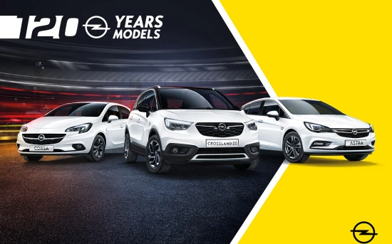 Οι επετειακοί εορτασμοί συμπληρώνονται από εκδόσεις μοντέλων “120 Years” . Αυτές οι ειδικές εκδόσεις των Opel Corsa, Astra, Insignia και των SUV Crossland X, Mokka X και Grandland X, προσφέρουν πλούσιο εξοπλισμό υψηλής τεχνολογίας, ιδιαίτερα στιλιστικά χαρακτηριστικά και συστήματα άνεσης. Τα αυτοκίνητα παίζουν πρωταγωνιστικό ρόλο στην καμπάνια στην τηλεόραση και το διαδίκτυο και συνοδεύονται από οικονομικές προσφορές και προτάσεις χρηματοδότησης. Στη Γερμανία, οι διαφημίσεις θα δίνουν επίσης το «παρών» στους εγχώριους αγώνες της Bundesliga των εταίρων της Opel Borussia Dortmund 09 και 1. FSV Mainz 05.