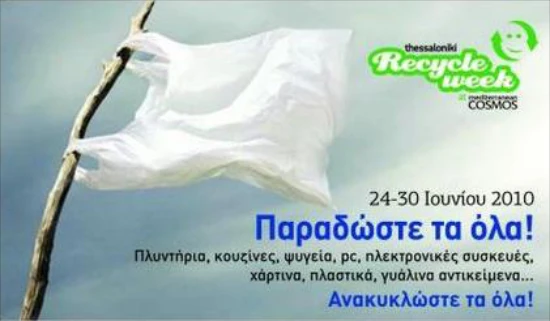 Mε το σύνθημα «Παραδώστε τα όλα – Ανακυκλώστε τα όλα» ξεκινάει στο Mediterranean Cosmos στη Θεσσαλονίκη από τις 24 έως και τις 30 Ιουνίου μία δράση με σκοπό την ενημέρωση των πολιτών για την ανακύκλωση συσκευών αλλά και την επαναχρησιμοποίηση αντικειμένων που δεν χρειαζόμαστε πια, όπως βιβλία, ρούχα και παιχνίδια.