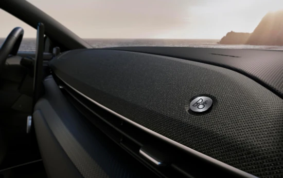 Αυτό καταλαμβάνει σχεδόν το 1/3 του του ταμπλό, γεγονός που καθιστά το νέο SUV στο πρώτο αυτοκίνητο με ηχοσύστημα σε τόσο περίοπτη θέση. Το ειδικά σχεδιασμένο ύφασμα Heathered Grey που καλύπτει τα tweeter στο ταμπλό αναπαράγει την εμφάνιση και αίσθηση των υφασμάτινων καλυμμάτων των θρυλικών οικιακών ηχείων της B&O, όντας ταυτόχρονα εξαιρετικά ανθεκτικό για χρήση στο αυτοκίνητο.