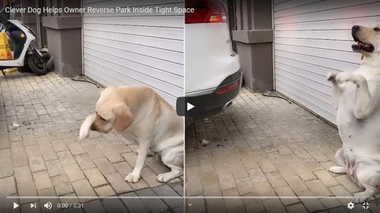 Ο σκύλος, είναι σίγουρα ο καλύτερος φίλος του ανθρώπου, αλλά ενίοτε είναι και ο καλύτερος φίλος του οδηγού. Εδώ βλέπουμε ένα golden retriever -προφανώς εκπαιδευμένο- να συνδράμει ηχητικά στην απόπειρα παρκαρίσματος του ιδιοκτήτη του. Η γάτα του σπιτιού από την άλλη είχε άλλη άποψη, και δήλωσε: "Ο μόνος λόγος που κάνει αυτές τις ματσακονιές το κοπροσκύλι, είναι αφενός επειδή είναι δουλική η φύση του, αφετέρου διότι βιάζεται να επιστρέψει ο άνθρωπος στο σπίτι για να του βάλει φαγητό"...