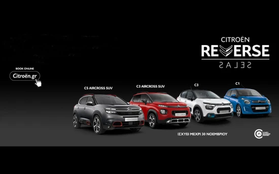 Η προωθητική ενέργεια CITROËN REVERSE SALES ισχύει μέχρι τις 31 Δεκεμβρίου 2020. Για περισσότερες πληροφορίες, επισκεφθείτε το Επίσημο Δίκτυο Διανομέων CITROËN ή την ιστοσελίδα www.citroen.gr .