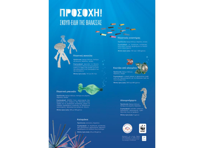 Στο πρόβλημα των σκουπιδιών που φτάνουν στη θάλασσα και συντελούν στο φαινόμενο των… θαλάσσιων σκουπιδότοπων θέλουν να επιστήσουν την προσοχή μας οι Μη Κυβερνητικές Οργανώσεις WWF Hellas και Δίκτυο ΜΕΣΟΓΕΙΟΣ SOS, δίνοντας στη δημοσιότητα λίστα των αποβλήτων που συχνότερα απορρίπτονται στη θάλασσα, τη διάρκεια ζωής τους, καθώς και τις επιπτώσεις αυτών στα θαλάσσια οικοσυστήματα.