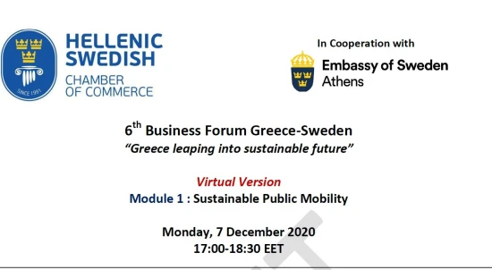 Το Ελληνο-Σουηδικό Εμπορικό Επιμελητήριο με τη συνεργασία της Πρεσβείας της Σουηδίας στην Ελλάδα διοργανώνουν για 6η συνεχή χρονιά το Επιχειρηματικό Φόρουμ Ελλάδας – Σουηδίας. Το Φόρουμ, με τίτλο Η Μετάβαση της Ελλάδας προς ένα Βιώσιμο Μέλλον, θα πραγματοποιηθεί σε ψηφιακό περιβάλλον και θα παρουσιαστεί σε θεματικές ενότητες με επίκεντρο τα Μέσα Μαζικής Μεταφοράς, τις Έξυπνες Πόλεις και την Κυκλική Οικονομία.
