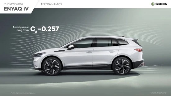Άκρως σημαντικός παράγοντας στην επίτευξη αυτού του αριθμού είναι ο πολύ χαμηλός συντελεστής οπισθέλκουσας, τον οποίο κατάφεραν οι σχεδιαστές της Skoda, μόλις 0,257 Cd. Για να φτάσουν σε αυτόν έπρεπε να μειώσουν όσο το δυνατόν περισσότερο και την αντίσταση στον αέρα αλλά και τον στροβιλισμό αυτού στο πίσω μέρος του αυτοκινήτου. Στο πρώτο εκ των δύο βοήθησαν τα ενεργά flaps στους μπροστινούς αεραγωγούς, τα οποία ελέγχουν τις απαιτήσεις του ηλεκτροκινητήρα και των υπόλοιπων μηχανικών μερών για ψύξη και ανοίγουν μόνο όσο χρειάζεται. Έτσι χρησιμοποιούν την απαραίτητη ποσότητα αέρα και ο υπόλοιπος έχει την δυνατότητα να γλιστρήσει πάνω και γύρω από το αυτοκίνητο, δίχως να το φρενάρει.