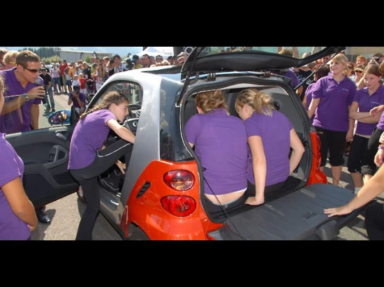 Καταρρίπτοντας το μέχρι τώρα παγκόσμιο ρεκόρ των 15 ατόμων, 16 γυναίκες στην Αυστρία χώρεσαν στο Smart Fortwo των 2.70 m. Το ρεκόρ επιτεύχθηκε σε μια εκδήλωση για Smart, στην Αυστρία, όπου συμμετείχαν περίπου 800 αυτοκίνητα. Στα πλαίσια της εκδήλωσης έγινε παρουσίαση και test-drive του νέου ηλεκτροκίνητου Smart.