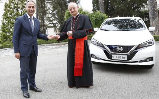 Το μηδενικών εκπομπών Leaf, το πρώτο ηλεκτρικό όχημα μαζικής παραγωγής (EV) στον κόσμο, παραδόθηκε στον Καρδινάλιο Giuseppe Bertello, Πρόεδρο της Κυβερνήσεως της Πόλης του Βατικανού και Πρόεδρο της Ποντιφικής Επιτροπής για το κράτος της Πόλης του Βατικανού.