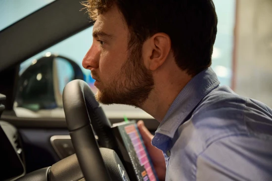 μηχανικός που αξιολογεί την οσμή του εσωτερικού των οχημάτων, με