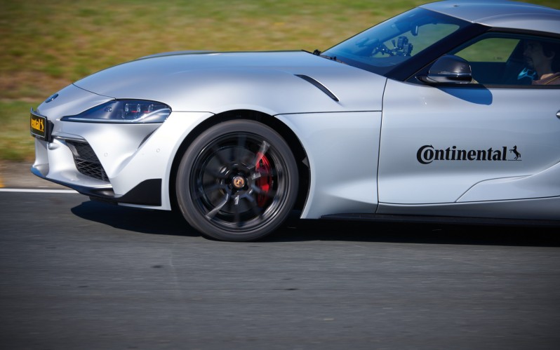 Ο εκπρόσωπος της πίσω κίνησης στη διαδικασία ήταν η Toyota Supra. Με καλύτερη κατανομή βάρους από το Hyundai, αλλά πιο μαλακή ανάρτηση, χρειάζεται ένα πραγματικά σπορ λάστιχο για να αναδείξει τον χαρακτήρα της. Και το SportContact 7 στάθηκε στο ύψος των περιστάσεων, και με το παραπάνω: Πρόσφερε αρκετά πληροφόρηση για να κινηθείς στο όριο, αλλά και αρκετή πρόσφυση ώστε σχεδόν να... φιμώσει ένα πισωκίνητο των 340 ίππων. Χρειαζόταν φόρα και επιτηδευμένος χειρισμός για να προκύψει η υπερστροφή, η οποία βέβαια στη συνέχεια ελεγχόταν με απολαυστικό τρόπο.