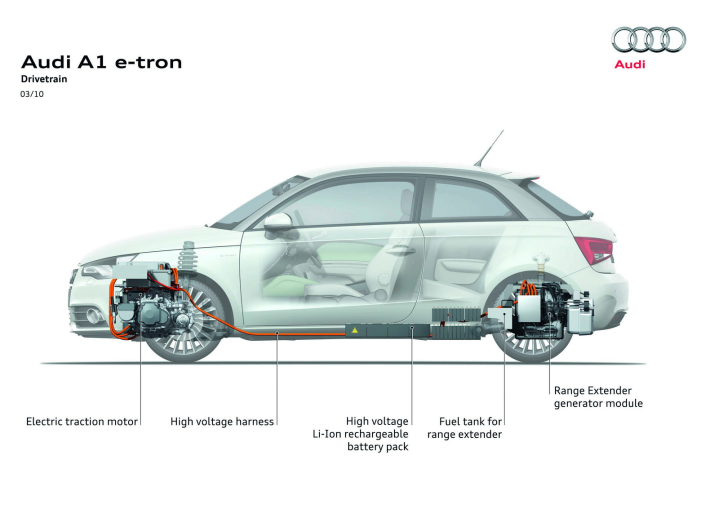 Το ηλεκτροκίνητο A1 e-tron έχει ισχύ 102 ίππων, τελική 130 km/h και μηδενικές εκπομπές ρύπων στα 50 km αυτονομίας που έχει στην πόλη. Όταν η μπαταρία ιόντων λιθίου αποφορτιστεί, την τροφοδοσία με ρεύμα αναλαμβάνει ένας μικρός κινητήρας Wankel παίζοντας το ρόλο της γεννήτριας. Έτσι, η συνολική αυτονομία αγγίζει τα 200 km, με μέση κατανάλωση 1,9 lt/100 km και εκπομπές ρύπων 45 gr/km.