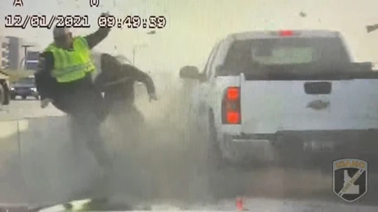 Στο video φαίνεται τόσο ο οδηγός του Toyota, αλλά και ο αστυνόμος να κοιτούν προς την κατεύθυνση που έρχονται τα οχήματα και κλάσματα του δευτερολέπτου αργότερα, δύο pick-up πέφτουν πάνω στο περιπολικό και το σταθμευμένο όχημα. Οι δύο πεζοί γλυτώνουν οριακά, με τον αστυνομικό μάλιστα να πηδά πάνω από την μπαριέρα για να ξεφύγει.