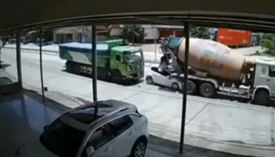 Όπως βλέπουμε, ο οδηγός του Honda στέκεται κανονικά στη λωρίδα περιμένοντας το φορτηγό που προπορεύεται να εκκινήσει. Ξαφνικά, ένα άλλο φορτηγό πλησιάζει από πίσω, εμβολίζει το μικρό ιαπωνικό μοντέλο και το σπρώχνει βιαίως προς τη μπετονιέρα.
