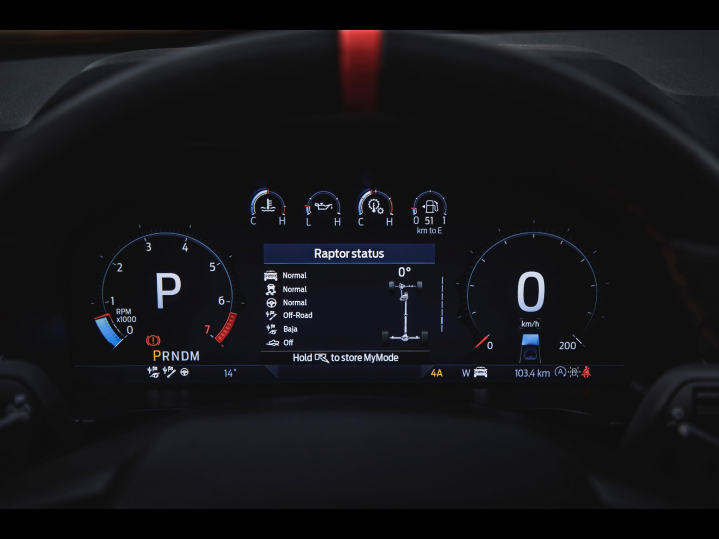 Την ίδια στιγμή, οι πινελιές Code Orange στον πίνακα οργάνων, στις επενδύσεις και τα καθίσματα, αντανακλώνται στον ambient φωτισμό του Ranger Raptor, που λούζει το εσωτερικό με μία κεχριμπαρένια (χρυσοκίτρινη) λάμψη. Ταυτόχρονα, το premium θερμαινόμενο τιμόνι με τη δερμάτινη επένδυση και την σπορ σχεδίαση διαθέτει επίσης ειδικές υποδοχές για τους αντίχειρες, σήμανση για τη θέση της ευθείας, καθώς και χειριστήρια αλλαγών σχέσεων για το 10-τάχυτο αυτόματο κιβώτιο από χυτό μαγνήσιο, τα οποία ολοκληρώνουν τη σπορ αίσθηση.