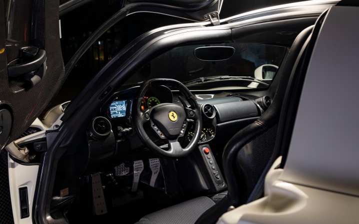 Η μοναδική λευκή Enzo είναι στο αμάξωμα «133023», βγήκε από το εργοστάσιο το Μάιο του 2003 και η δημοπρασία της έχει οριστεί για τις 29 Ιουνίου. Το χρώμα έχει τον κωδικό «Bianco Avus» και στο εσωτερικό είναι εξοπλισμένη με μαύρο δέρμα και carbon μπάκετ καθίσματα. Το αυτοκίνητο αρχικά άνηκε σε έναν δισεκατομμυριούχο από την Ελβετία, ο οποίος και την είχε στην προσωπική του συλλογή. Εν συνεχεία η Enzoβρέθηκε στο Χονγκ Κονγκ, αλλά χωρίς να βγάλει πινακίδες, αφού είναι αριστεροτίμονη. Αυτό έχει σαν αποτέλεσμα να έχει κάνει μέσα σε 19 χρόνια λιγότερα από 10.000 km!