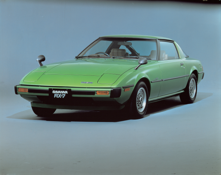 Η πρώτη γενιά RX-7 (πλατφόρμα “FB”) κυκλοφόρησε στην ιαπωνική αγορά το 1978 και θριάμβευσε κατευθείαν. Με καθαρό βάρος κοντά στον 1 τόνο, το 12Α’s 100-135PS πέτυχε μεγάλες αποδόσεις. Η compact μηχανή τοποθετημένη πίσω από τον μπροστινό άξονα, καθώς και η πισωκίνητη οδήγηση με σχεδόν τέλεια κατανομή του βάρους, βοήθησαν στην απίστευτη αυτή πορεία του. Το αεροδυναμικό RX-7 που προσέφερε διασκεδαστική οδήγηση, δημιούργησε μία ξεχωριστή σύνδεση μεταξύ οδηγού και αυτοκινήτου. Ο 1,146cm3 διπλού ρότορα 12A εντάχθηκε αργότερα με μια 160PS turbo εκδοχή για την Ιαπωνία, ενώ στη Βόρεια Αμερική κυκλοφόρησε ένα ελαφρώς μεγαλύτερο 13Β μηχανικό σύνολο με έγχυση καυσίμου.
